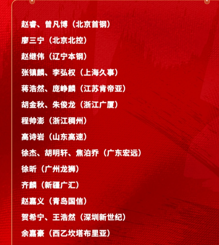 其中球员就包括了北京首钢的赵睿和曾凡博,其中没有周琦;北控男篮的廖三宁,山东男篮的高诗岩,浙江稠州的程帅澎则作为其老部将依旧被带上了。值得一提的是辽宁男篮的赵继伟回归此次集训名单;上海久事则派出了张镇麟、李弘权以及此次首次入选的江苏男篮的庞峥麟以及蒋浩然;浙江广厦这边则有胡金秋和朱俊龙,然而孙铭徽依旧没有被选中。广东宏远则意外的有三人入选,分别是徐杰、胡明轩以及焦伯乔。广州龙狮则是徐昕被征召;新疆男篮的齐麟以及青岛男篮的赵嘉义,以及深圳男篮双子星的贺希宁、王浩然,最后还有国外征战的余嘉豪。